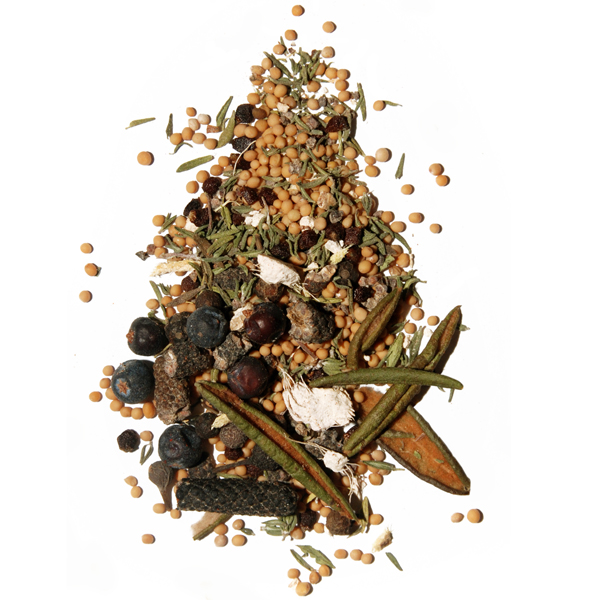 Složení: tymián mletý, bobkový list mletý, koriandr mletý, pepř černý mletý, jalovec mletý, hřebíček mletý, šalvěj mletá